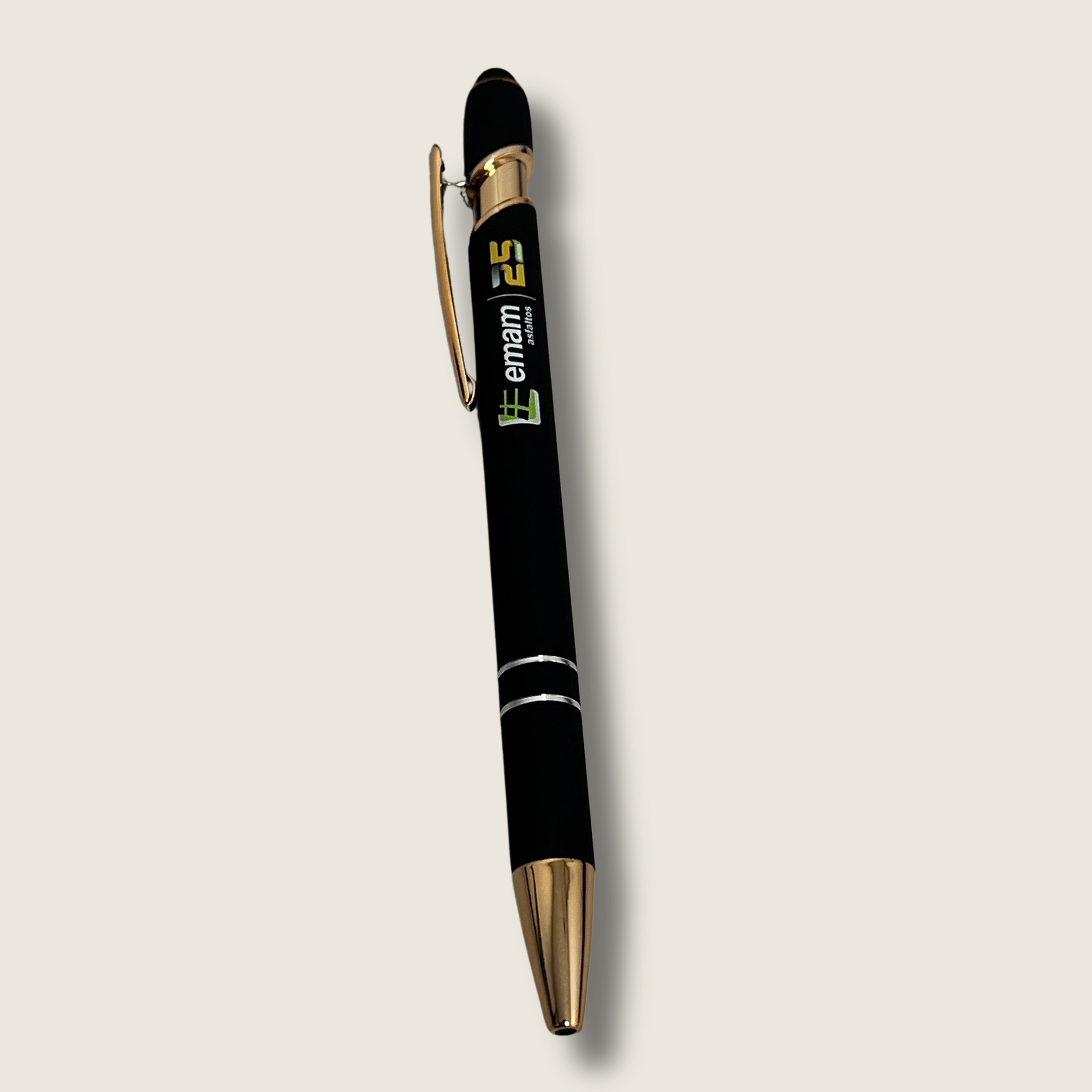 Caneta personalizada com tinta azul e ponta em touch, para uso em celulares, tablets e computadores.